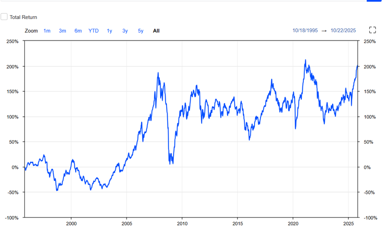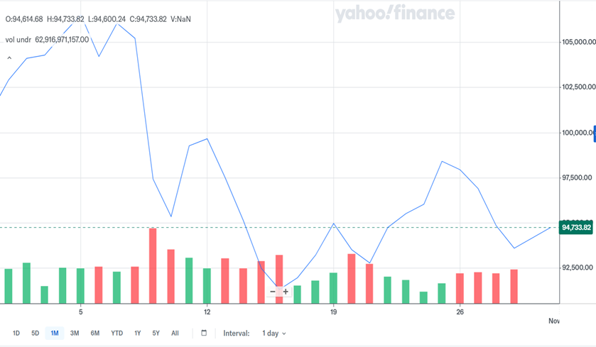 Bitcoin je v mesecu oktobru upadel za cca. 3 %. 5. oktobra je dosegel najvišjo vrednost vseh časov in presegel 106.000 EUR, nato pa hitro zopet upadel pod vrednost 95.000 EUR, kot je razvidno iz spodnjega grafa.