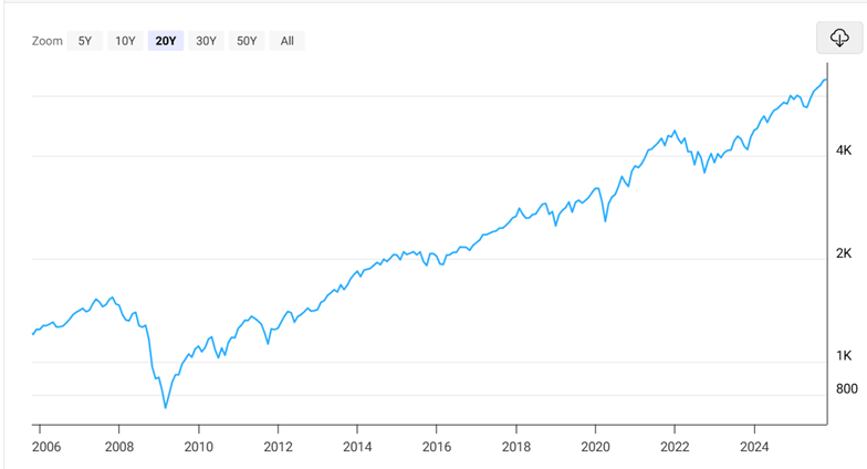 Spodnja grafa nam prikazujeta gibanje donosnosti delniških indeksov MSCI EM in S&P 500 skozi zgodovino, kjer se lepo vidi zaostajanje v donosnosti po letu 2008 in ponoven vzpon indeksa MSCI EM leta 2024.