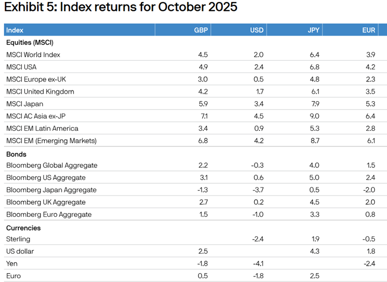 V teh razmerah je primerjalni indeks globalnih razvitih trgov MSCI WORLD v mesecu oktobru pridobil visokih 3.9 %(EUR), kot je razvidno iz spodnje tabele. Od razvitih trgov odlično tudi ameriške delnice, njihova primerjalni indeks MSCI US je pridobi 4.2 % (EUR). Delnice trgov v razvoju pa še bolje, njihov globalni primerjalni indeks MSCI EM je v oktobru pridobil kar 6.1 % (EUR).
