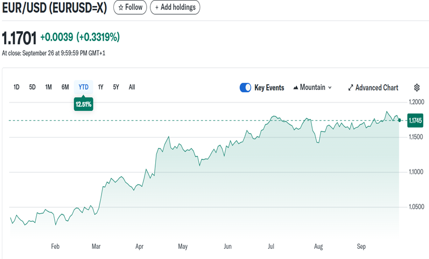 Zgornji graf prikazuje gibanje vrednosti EUR napram USD v obdobju letošnjega leta. Tako je EUR pridobil napram USD več kot 13 % vrednosti, za prav toliko pa je tudi donosnost ameriških naložb za vlagatelje v evrih nižja od dolarskih.