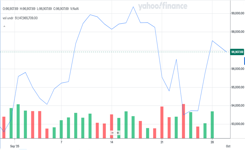 Bitcoin je v mesecu septembru zrastel za slabih 5 %. 18. septembra pa se je skoraj dotaknil mejnika 100.000 EUR, kot je razvidno iz spodnjega grafa.
